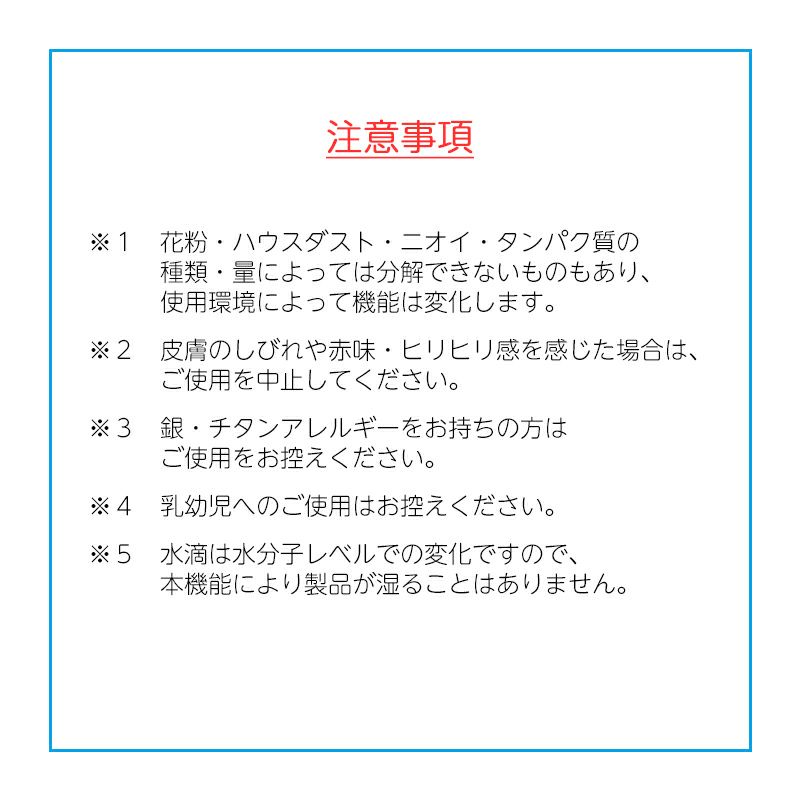 - 花粉・ハウスダストや不衛生タンパク質を強力に分解し、水分子化するハイドロ銀チタンⓇの仕組みです。